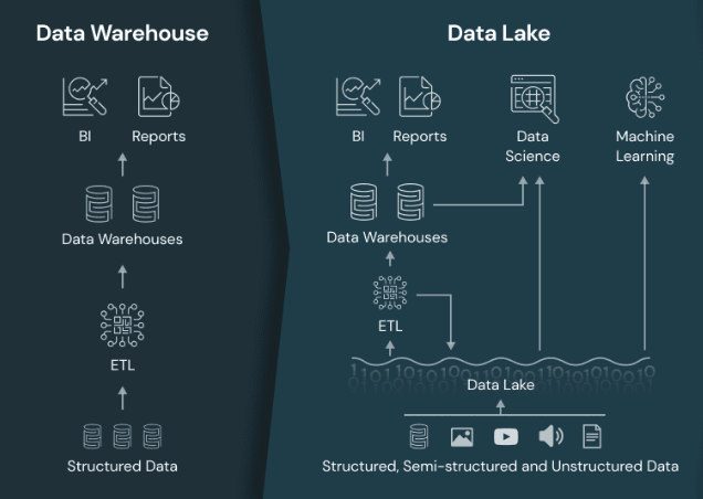 데이터 레이크는 더 크고 원본에 가까운 데이터 저장소를 뜻한다. 데이터 웨어하우스는 데이터 저장 전 미리 정의된 스키마를 적용해야했으나, 데이터 레이크는 비정형 데이터를 포함해 다양한 구조의 데이터를 저장할 수 있다.